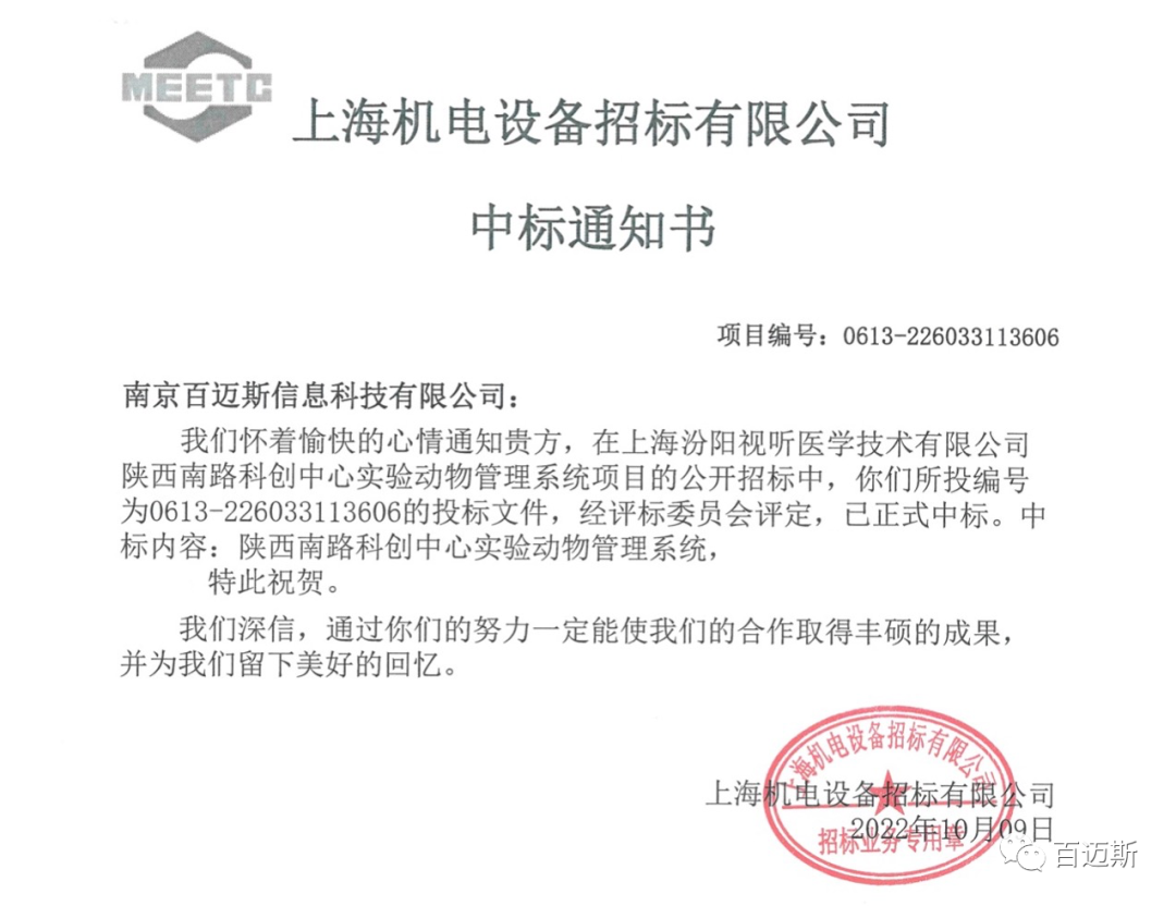 疫情肆虐的壬寅之年,经济形势下行。百迈斯步履不歇再次传来喜讯,凭借优秀的技术方案、丰富的行业经验以及良好的品牌信誉,经过开标、评标及公示等程序,最终被确定为项目中标单位。成功中标上海汾阳视听医学技术有限公司的“陕西南路科创中心实验动物管理系统”项目。