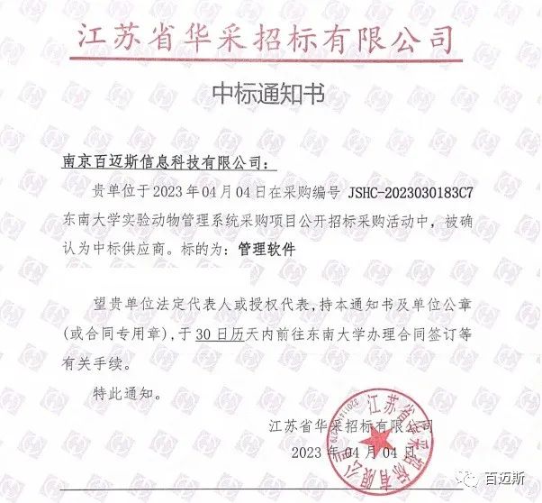 百迈斯凭借优秀的技术方案、丰富的行业经验以及良好的品牌信誉,经过开标、评标及公示等程序,最终被确定为项目中标单位 。成功中标东南大学的“实验动物管理系统采购”项目。